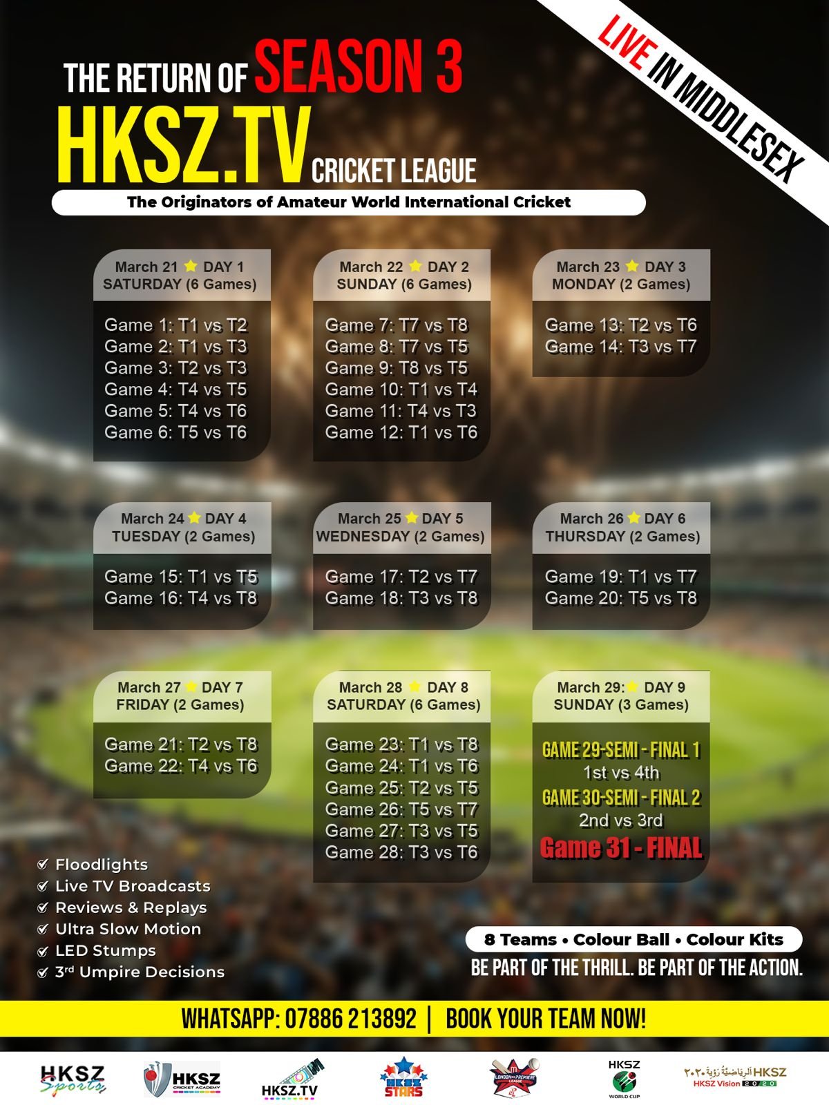 Players will be live streamed worldwide on HKSZ. TV platforms hence upmost discipline and good behaviour is required in strict spirit of the game and according to rules with full issued attire failing to wear full issued attire on tv will render the player or players in default and fined £330 per game the attire was not worn no other attire is permitted ti he worn during any games at anytime other then the issued the attire must not be removed taken off until player is ready to leave the ground at end of games any handshakes with other tema on ground must be in issues attire failing which a fine of £330 per match will be issued, it is the responsibility of all participants to provide adequate UK residence ID, if a non UK residents are intended participants they will need to disclose to the league the participants residential status, as in certain circumstances of a visit visa or asylum case a individual may not qualify for public broadcasts or other factors such as protective identity and other case related reasons, therefore to safeguard the integrity of not only the rules laws of the land but intended participant and or participants are to supply the relevant required and requested information satisfying league requirements and or sporting /countries legislations failing which it will be deemed as a material default and the team or player will not be able to play and or disqualified if found to have concealed such statuses, the club insurance must be supplied as well as the participants can confirm their liabilities and to indemnify the league from any and all liabilities that may incur or arise due to the negligence of the participating parties, the participants automatically confirm by playing in the league that they are compliant and satisfy the legal needful regulations and policies insurances, legislations approvals etc a club would require for its representatives including updated DBS, ECB ACO etc., all players and participants associates can confirm that they have been full UK residence without any home office or other legal restrictions for the last 10 years counted backwards from 2020 unless otherwise agreed (subject to disclosure of all participants documentation). All participants can confirm that they have had no pending legal actions or convictions in any form whatsoever should this be found the participating team or its player may be disqualified immediately. In all defaulting or breaching circumstances the participants shall render and pay all penalties and costs the league its organisers partners representatives shall have incurred at the full price of £100 per match per player covering all the fixtures the player or participant was scheduled to participate within, no foul language whatsoever will be tolerated, no threats, no aggression no violence or such illicit conduct that may harm the league or its representatives, the league reserves the rights to legally prosecute all or any parties found to be threatening in any way whatsoever fines of £330 per match will be issued on any such actions and or with match bans and possible disqualification, any breaches of rules or regs playing breaches will in addition also incur 5 penalty runs being given by umpires as well as match bans or then disqualification should matters incur during play, umpires decisions will be final, no questioning an umpires decision, even if reviewed and decision is not in the favour of the reviewed a disciplined acceptance of conduct is important in order to demonstrate goodfaith of the game and in order to maintain the spirit of the game at all times also during any live broadcast. Umpires are advised to encourage young players to enhance there performances, umpires are also to be attentive ball by ball and demonstrate their umpiring Skills to the their upmost ability failing which umpires will be liable to sanctions too as it’s a live broadcast, hence an umpire will be subjected to critics beyond the control of the broadcasters and organisers, hence Umpires are advised to encourage young players to enhance their performances bowl there overs in a timely manner in accordance to international standards thus setting development standards, umpires also to be attentive in checking run outs if not sure they have the full tv review camera facility, hence to be attentive ball to ball, to be checking no balls, if not sure on a decision make use of the digital platform and to review the decision by signaling to the 3rd umpire who will then take the review from the pavilion with the broadcast crew. The umpires confirm by their actions to keep the league its members representatives organisers players free from any and all such damages arising from the fault of their performed duties, umpires will exercise patience and cooperation with the league it’s players it’s organizers it’s representatives, and if anyone is found to have engaged in any foul language/ Behaviour or unacceptable conduct or is seen/noted spotted with such conduct be it from a player or umpire will be liable to sanctions by the leagues organisers. A warning will be given by management to players and to umpires, or if umpires to players which ever the case followed by 5 penalty runs or if umpires a match ban with loss of the innings fee, if foul conduct continues from players the Captain will be advised to remove the player of the field for 3 overs, if umpires the organisers reserve the right to remove the umpire from live play still if conduct is not acceptable the umpires may request the league for the player to be disqualified and likewise the league for the umpire, in such circumstances the player would have lost his £330 or any and all fees in lieu of damages the league would have incurred notwithstanding broadcast costs, if umpires, then his innings or other fees as deemed necessary, playing in the league is an acceptance to all league rules to maintain discipline. The league management reserve the right to implement any rul
